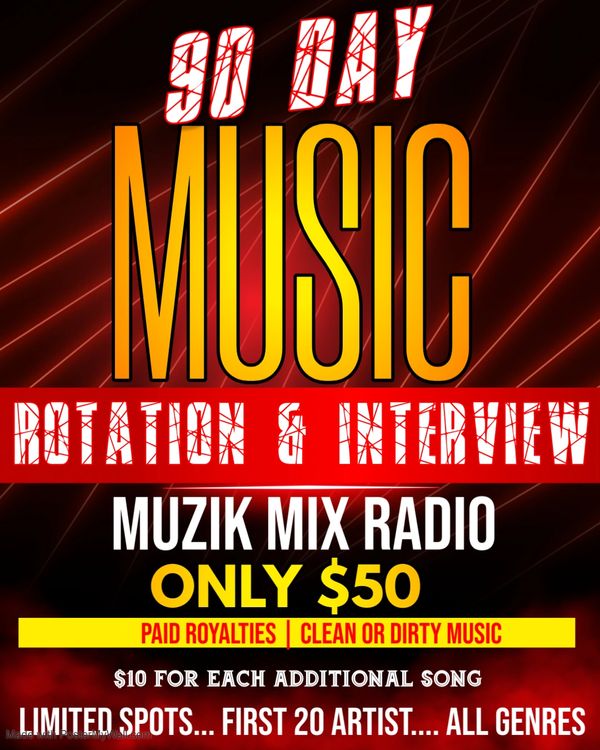 90 DAY MUZIK ROTATION AND INTERVIEW FOR ONLY $50......ACT FAST SPOTS ARE LIMITED